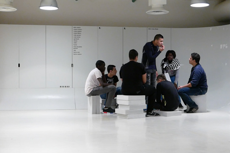 Si nous pensions le langage comme excès, le silence serait cet espace où advient le sens. Mise en silence est une performance collective et polylingue écrite en collaboration avec une trentaine d’adolescents allophones arrivés depuis peu en France. Munis de portevoix, ils se proposent de jouer avec les étendues de propagation du son au sein du Centre Pompidou, de composer un nouvel espace d’échange – dilaté – par voie acoustique afin d’y révéler la puissance du silence.