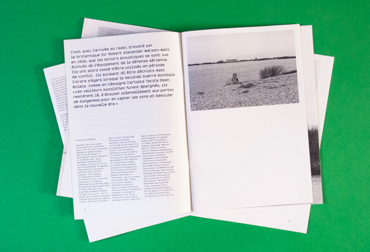 Le contenu de cette édition, accompagnée d'un poster, se décompose en trois parties autonomes élaborées à partir d'un même système : une collecte iconographique donnant à voir des dispositifs militaires désuets datant de la Première et Seconde Guerre mondiale, enveloppée d'un étui textuel. Soit deux livrets qui présentent, par une collecte d'images d'archives, le camouflage Dazzle et les grandes oreilles ; et un livret consacré à celui des miroirs acoustiques dont j’ai produit pour l'occasion les images, en 2016, sur l'ancien site de la Royal Air Force à Dungeness, dans le Kent, en Angleterre.