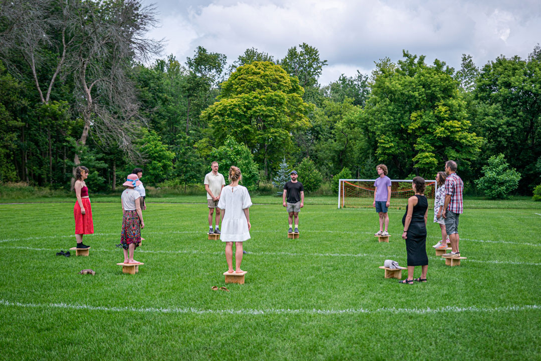 Cette performance s’inspire d’un cycle d’ateliers basés sur des expériences sensibles que j’ai mené ces dernières années avec différents publics au sujet des pédagogies sonores alternatives et de l’écoute comme acte politique et militant. Dans le contexte de cette performance, j’invite des participant·es à se joindre à moi pour une expérience à l’extérieur du musée en étant muni·es d’un accessoire en bois : une sorte de tabouret permettant trois positions distinctes nécessitant de trouver notre équilibre corporel pour écouter. À travers une série d’instructions collectives, en réponse aux paysages sonores environnants, je leur propose de faire l’expérience d’un renversement de perspective : que se passe-t-il lorsque ce n’est plus la vue mais l’ouïe qui est sollicitée en premier lieu? Comment notre corps peut-il nous engager dans l’action d’écouter? Comment l’action d'écouter peut-elle nous renseigner sur le monde qui nous entoure?