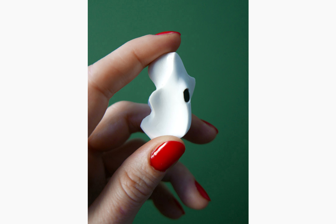 Pour cette série de sculptures pensées à l’échelle auriculaire, je rejoue les gestes qu’opère l’audioprothésiste pour pendre l’empreinte du canal auditif externe. Je réalise ces sculptures sur mesure à l’adresse d’une personne : celle qui veut bien me prêter ses oreilles. Elles sont réalisées selon le principe suivant : saisissable par deux doigts, sa taille ne dépasse pas l’écart existant entre le pouce et l’index. De poids léger, elle est portée à l’oreille pour être exhibée en situation de mobilité.