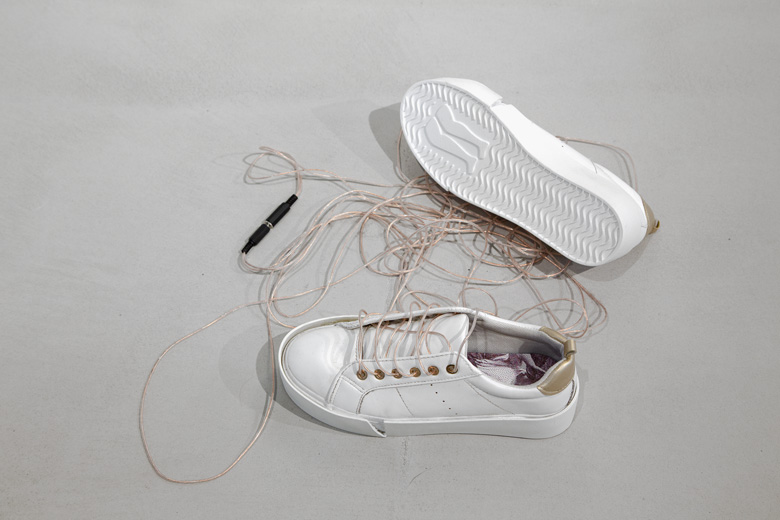 Your Feet Become Ears est un titre qui fait explicitement référence à la partition Native de la compositrice Pauline Oliveros dans Sonic Meditations(1974). Voilà ce qu’elle dit aux participantes : « Take a walk at night. Walk so silently that the bottoms of your feet become ears. ». Attentive aux environnements sonores qui nous entourent par l’action de marcher, je propose de revêtir cette paire de baskets personnalisée — devenue à la fois accessoire à performer et support à mes croyances personnelles — pour les parcourir et les écouter. Si marcher vient du mot marquer, les empreintes que s’apprêtent à laisser ces baskets s’annoncent comme autant de marqueurs, à même de rappeler à la mémoire l’écoute des espaces traversés.